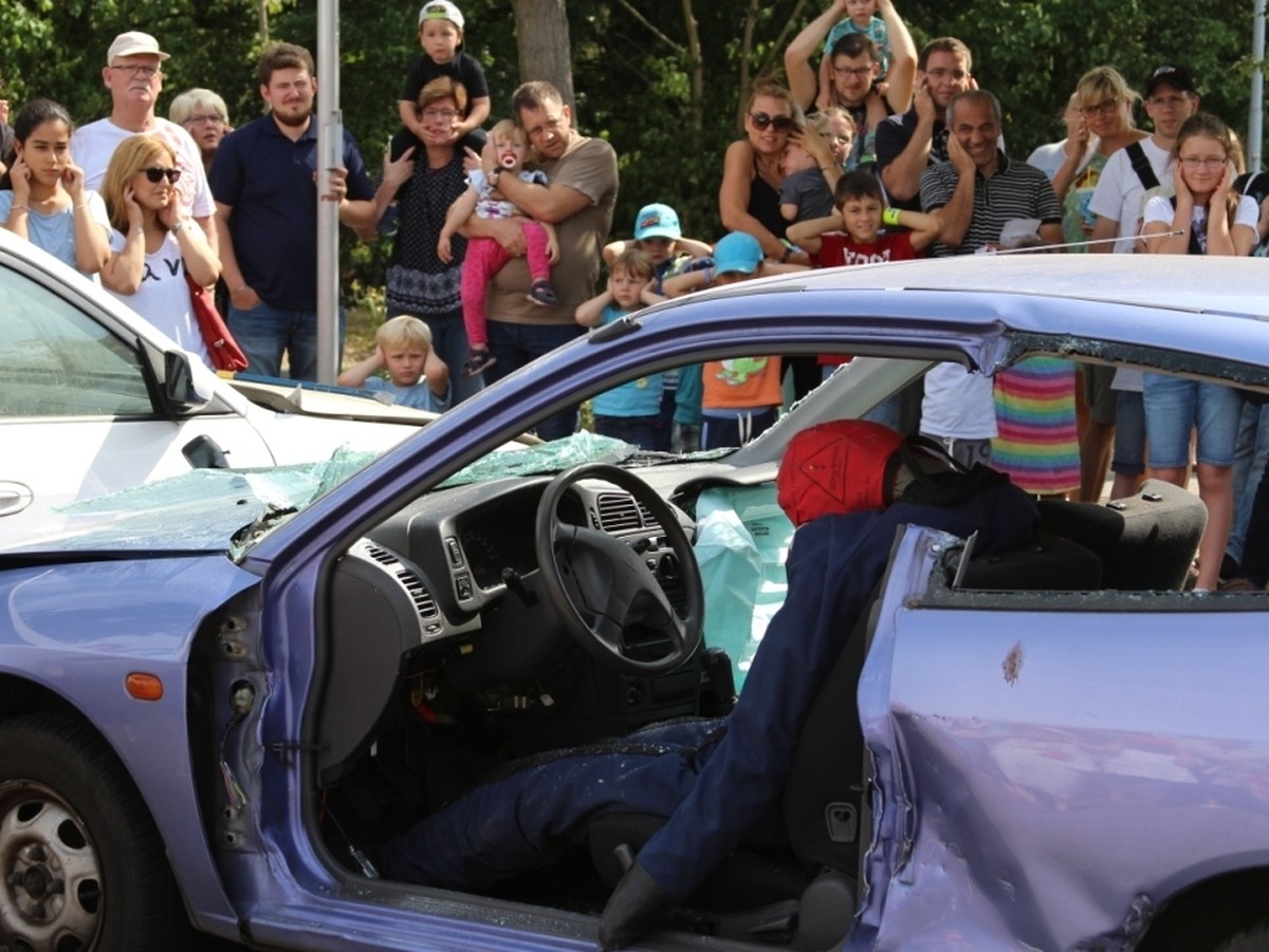 Zuvor hatten die Helfer gezeigt, wie Rettungsschere und Rettungsspreizer richtig gehandhabt werden. Die meisten Besucher waren außerdem sehr beeindruckt, als Feuerwehrmann Ralph Schrod vorführte, welche Kräfte wirken, wenn während eines Unfalls die Airbags in einem Auto ausgelöst werden. Nach dem ohrenbetäubenden Knall war klar, warum ein eingeschalteter Airbag vor allem einem auf dem Beifahrersitz in Babyschale transportierten Kleinkind sehr gefährlich werden kann. Mit riesiger Wucht wurde die Schale von dem sich aufblasenden Airbag gegen die Rückenlehne des Beifahrersitzes gedrückt.