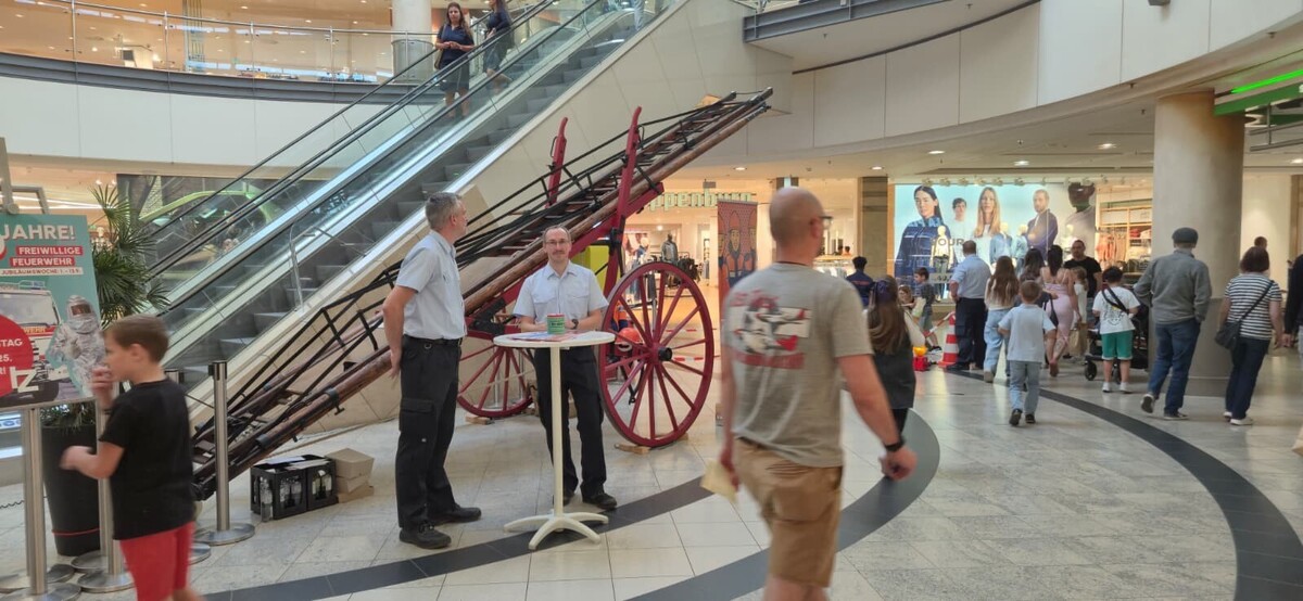 Im ersten Obergeschoss des Centers - schräg gegenüber von Saturn - gibt es noch bis 13. September in einer Mini-Ausstellung die Möglichkeit, einen Überblick über Historie und gegenwärtiges Wirken der ehrenamtlichen Brandschützer zu bekommen - im Laden direkt neben dem Süßwaren-Outlet.